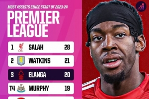 据Opta数据统计,自2023-24赛季以来,英超的助攻榜单中,萨拉赫以28次独占鳌头,维拉前锋沃特金斯21次排名第二,伊兰加20次排名第三。